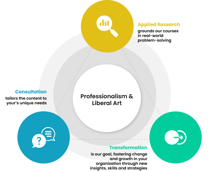 The training component of ACT draws upon liberal arts principles, emphasizing critical thinking, problem-solving, creativity, and communication skills. Designed to be practical and hands-on, our training enables participants to apply their skills in real-world scenarios. Adopting the SIR (Short, Integrated, Relevant) approach, our executive training prioritizes concise, efficient, and practical content. By integrating various disciplines, participants develop a comprehensive understanding and can apply knowledge across different fields, bridging the gap between broad academic knowledge and real-world applicability.